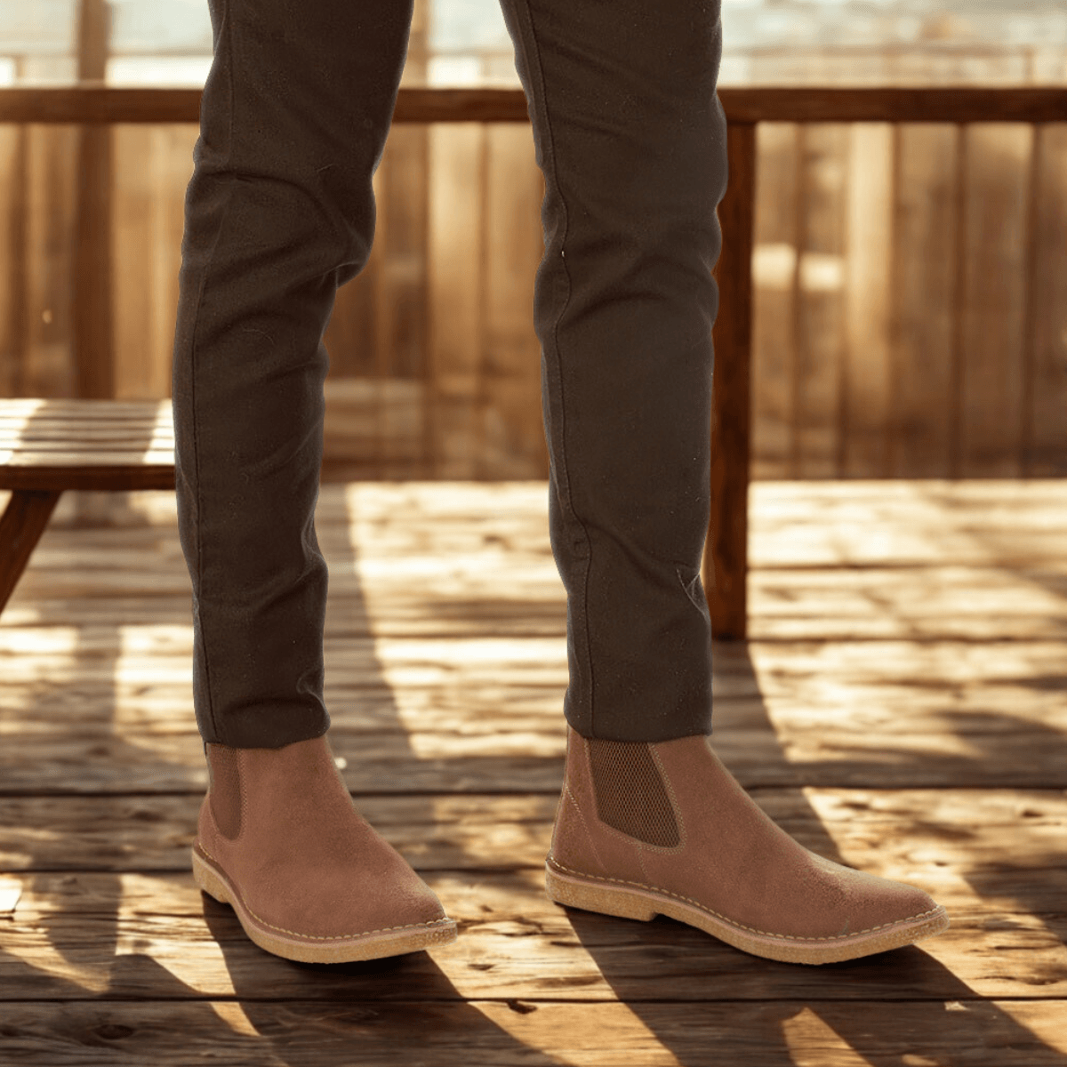 Bota Chelsea em couro legítimo camurça, forrada em tecido com espuma de alta densidade, solado em borracha látex natural com textura crepe, e palmilha anatômica em E.V.A.