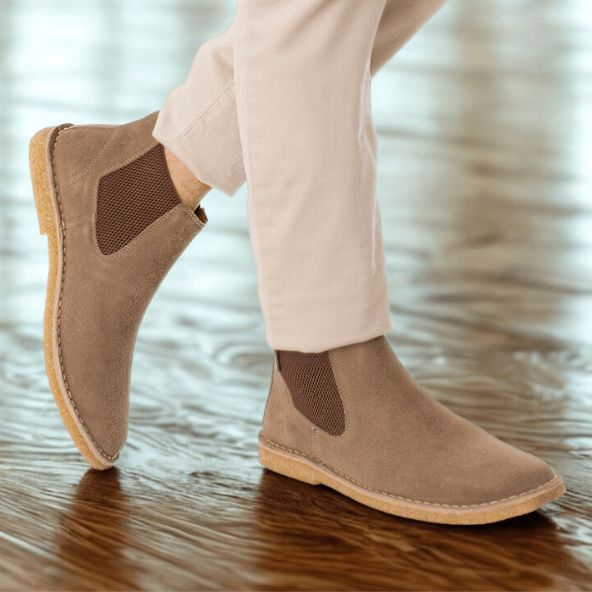 Bota Chelsea em couro legítimo camurça, forrada em tecido com espuma de alta densidade, solado em borracha látex natural com textura crepe, e palmilha anatômica em E.V.A.